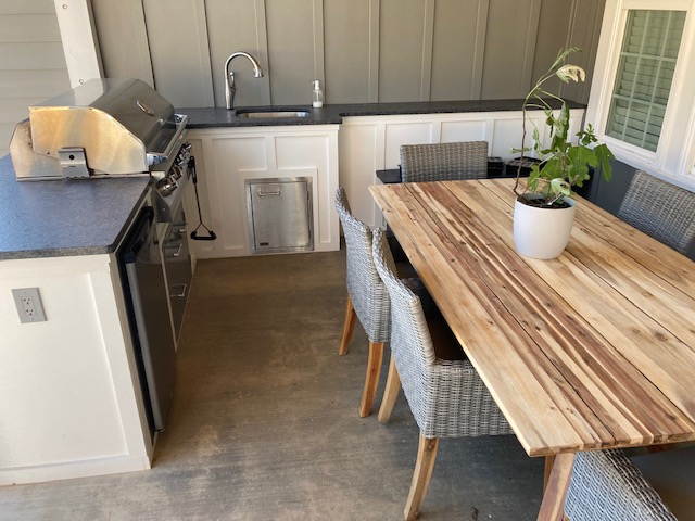 As always, it’s important to consider your outdoor living space’s primary function. Are you a chef-in-training? Then focus on the kitchen appliances, barbecue grill, and layout. Do you plan on throwing dinner parties? Will this be near a pool? Will it just be an area to lounge, eat and relax? Will you want to watch football outside? Will you need a ceiling fan?